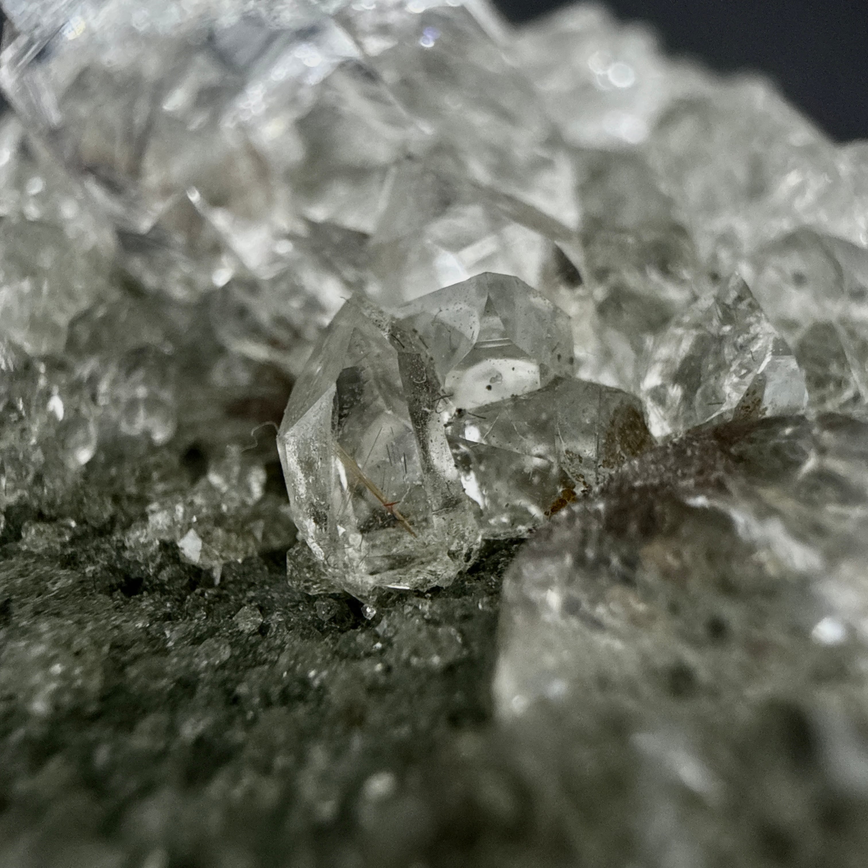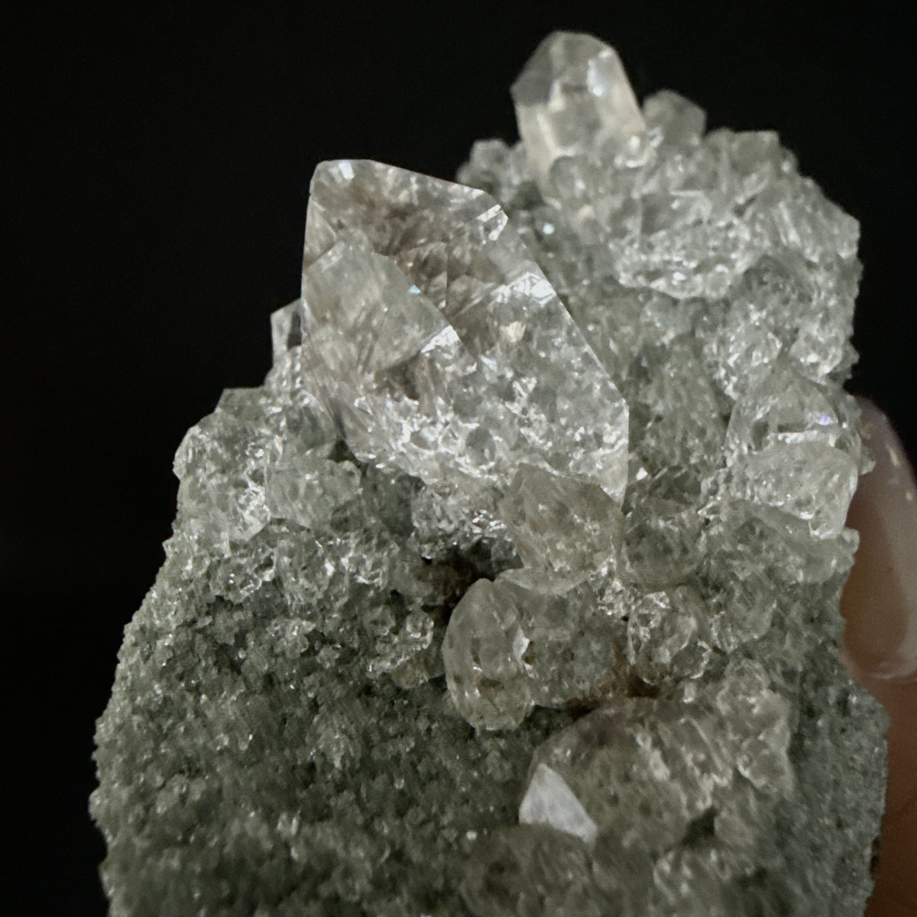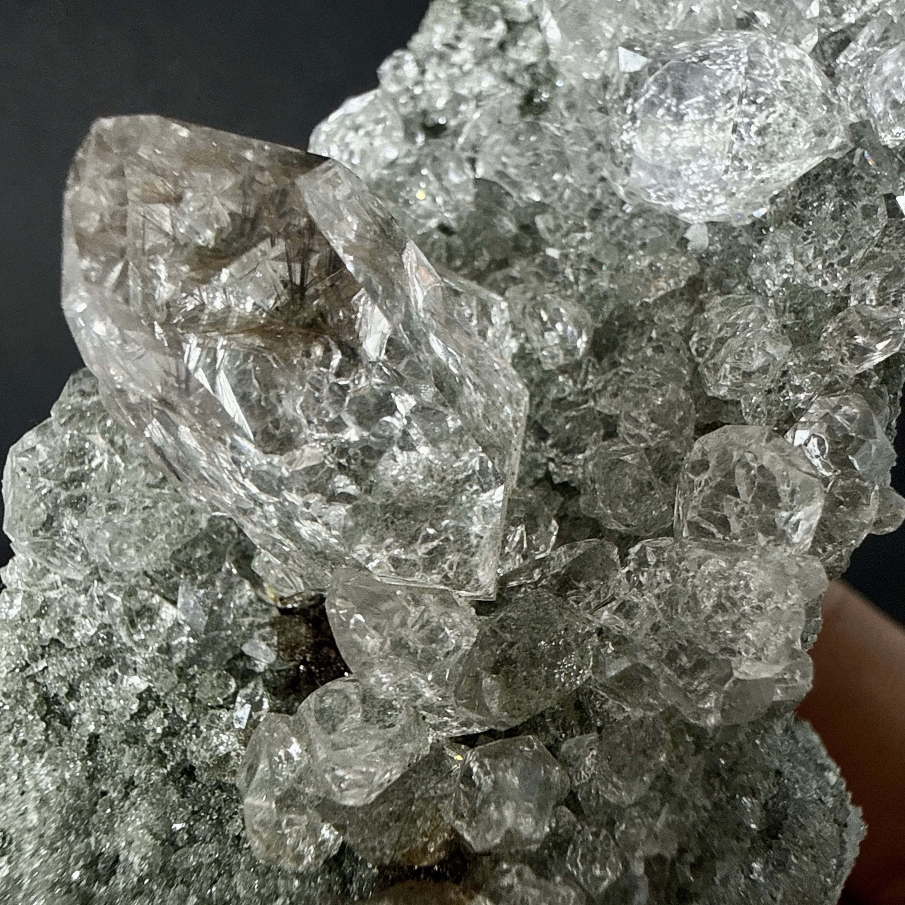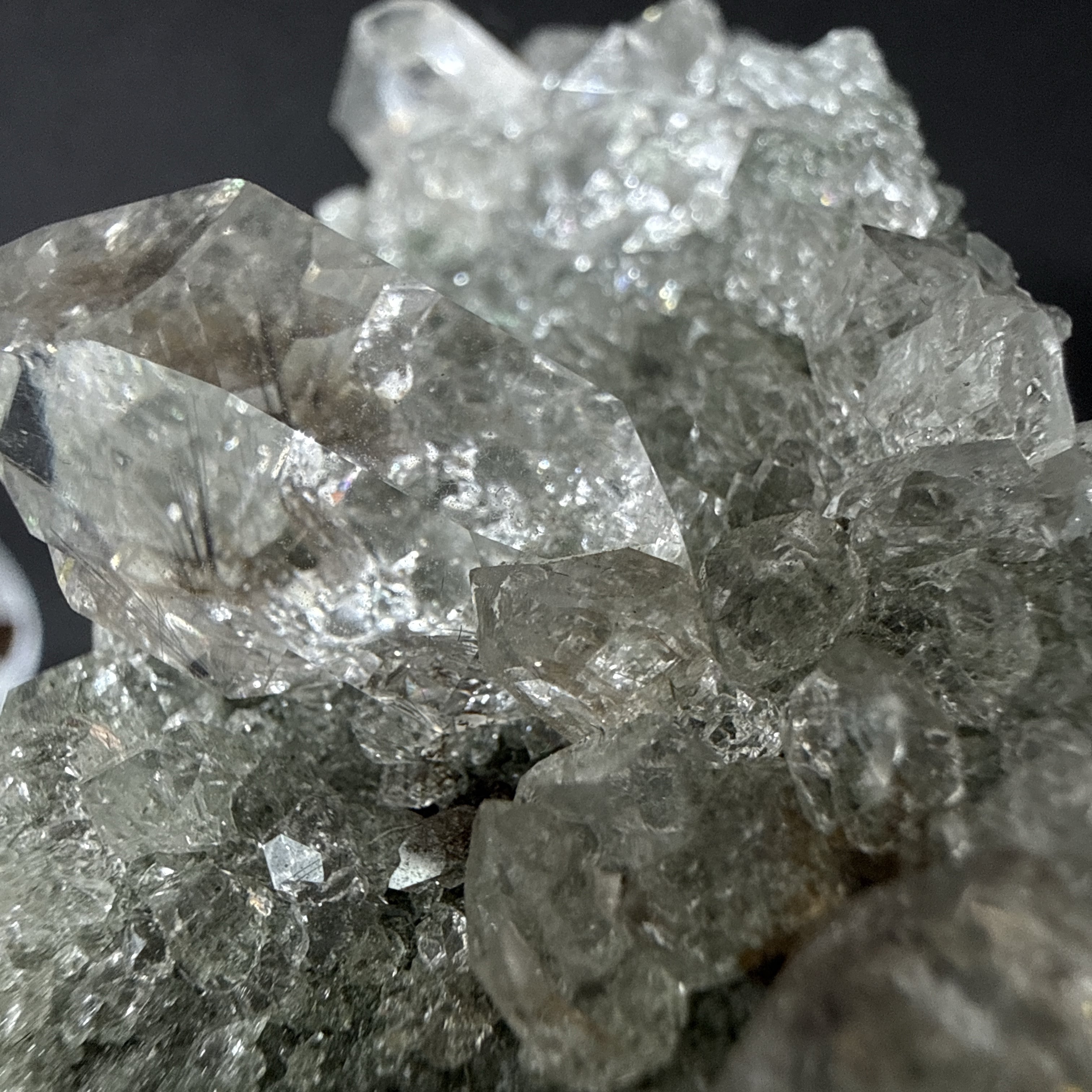 また、マニハール産のヒマラヤ水晶には、アナテースと呼ばれる黒い粒状の鋭錐石が付着しているものもあり、これはクローライトを伴う産地では他にない特徴です。