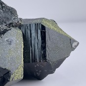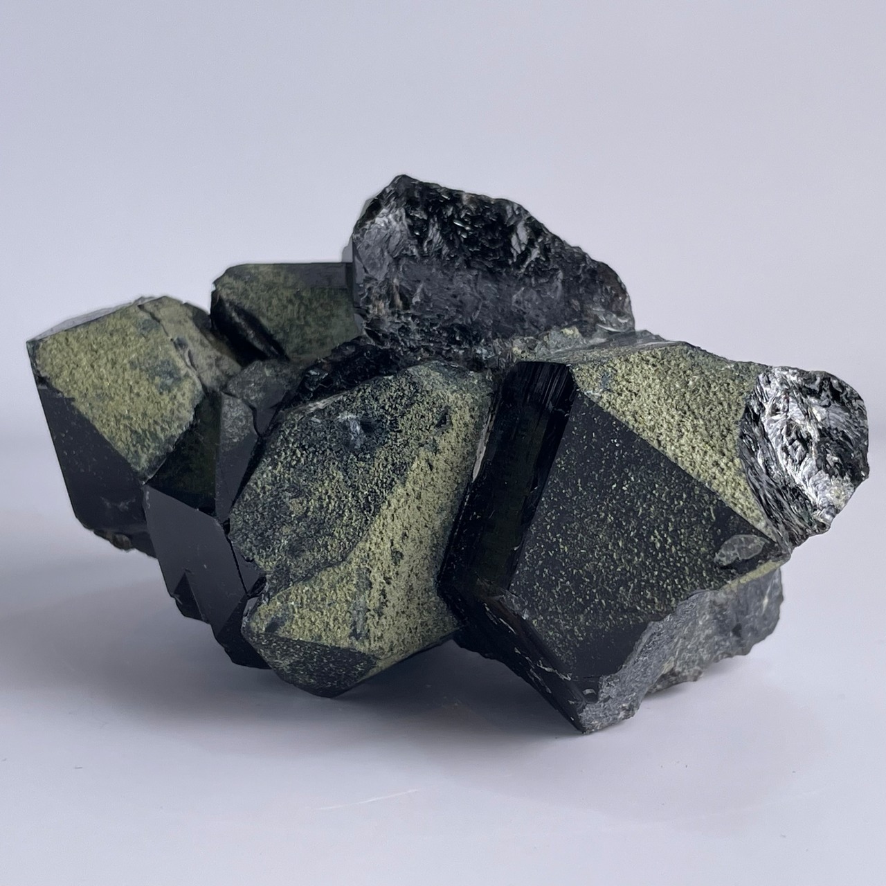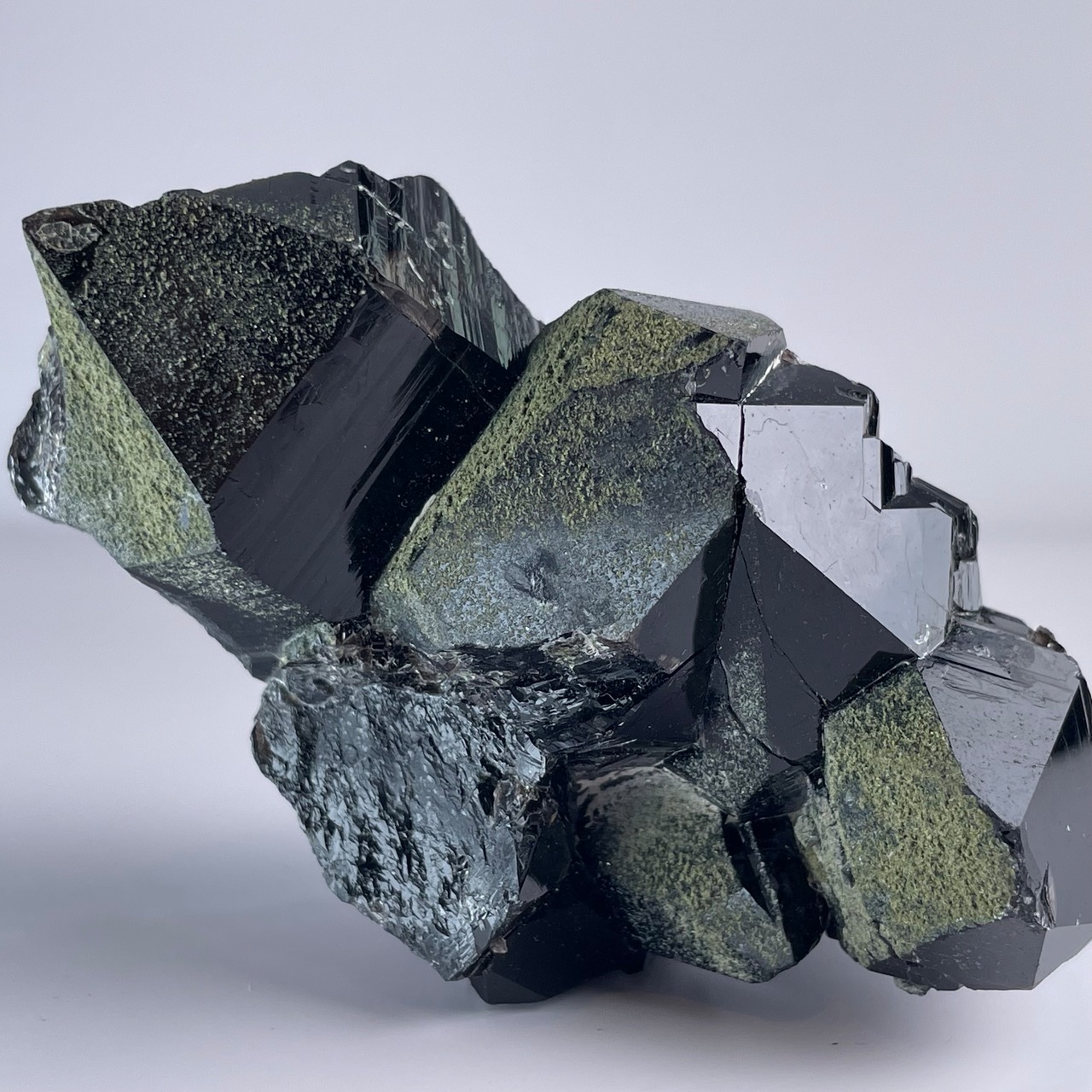 テリ艶ある漆黒の黒水晶(モリオン)を飾る様に深緑のクローライトが苔の様に付着しており、上品で雰囲気あるモリオンクラスターです。