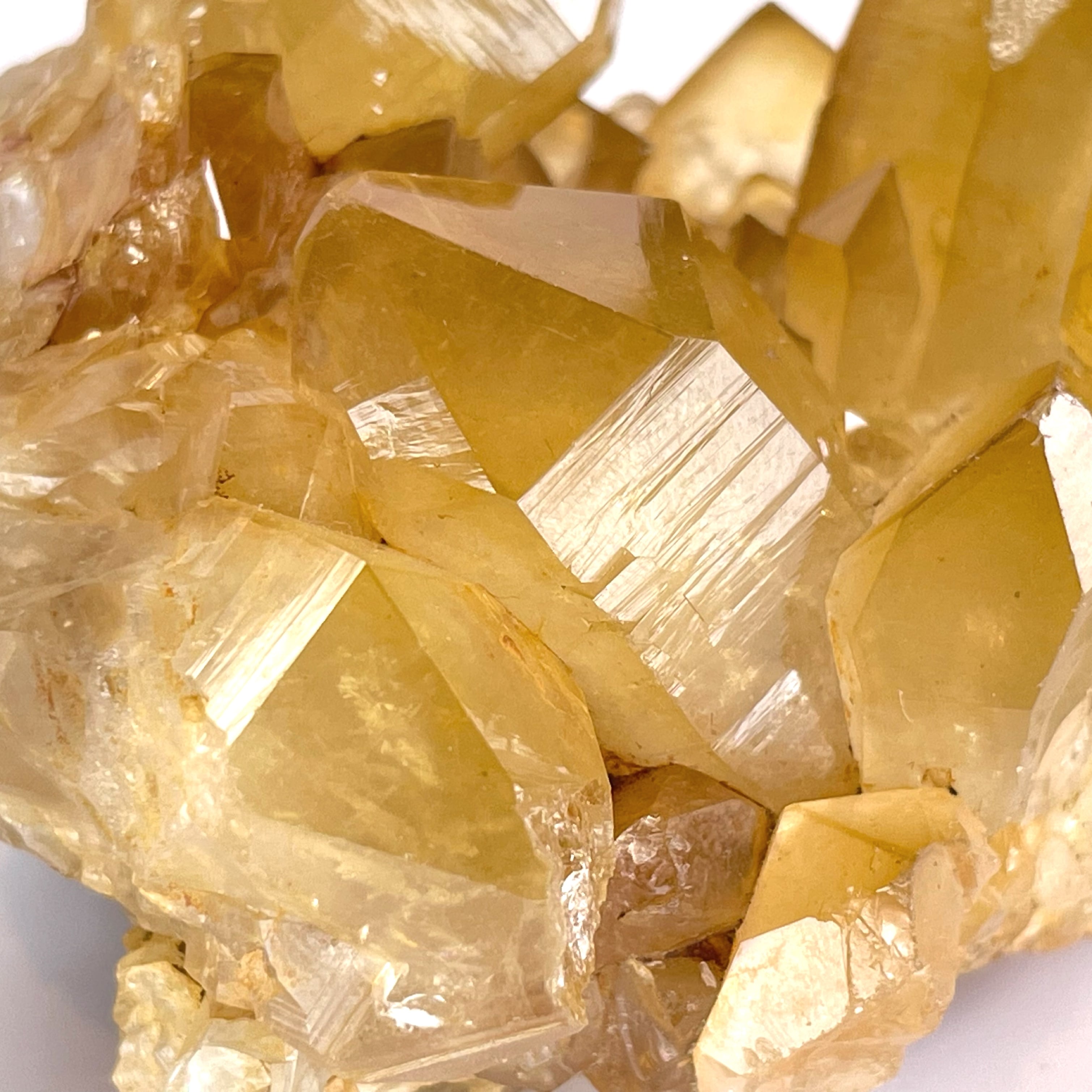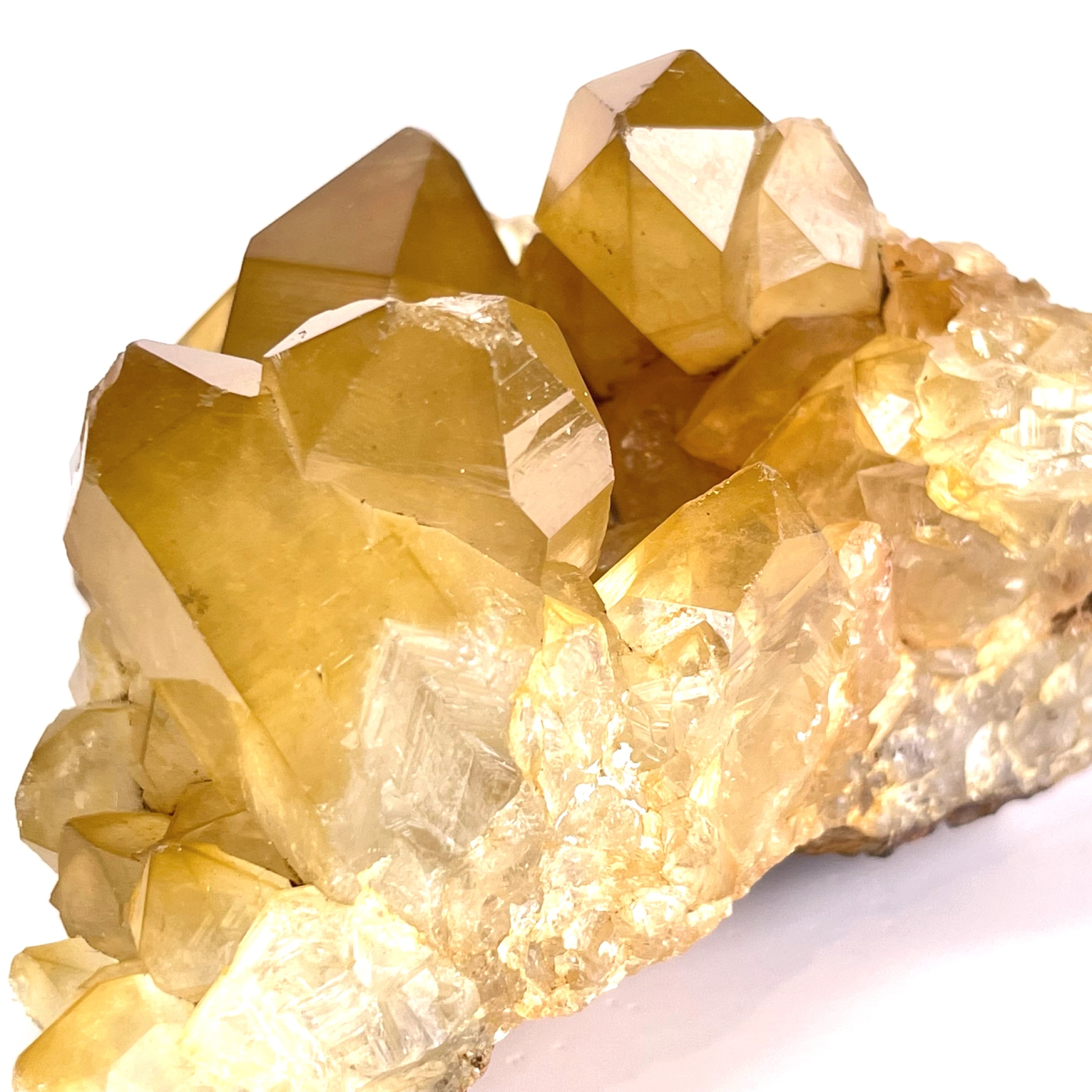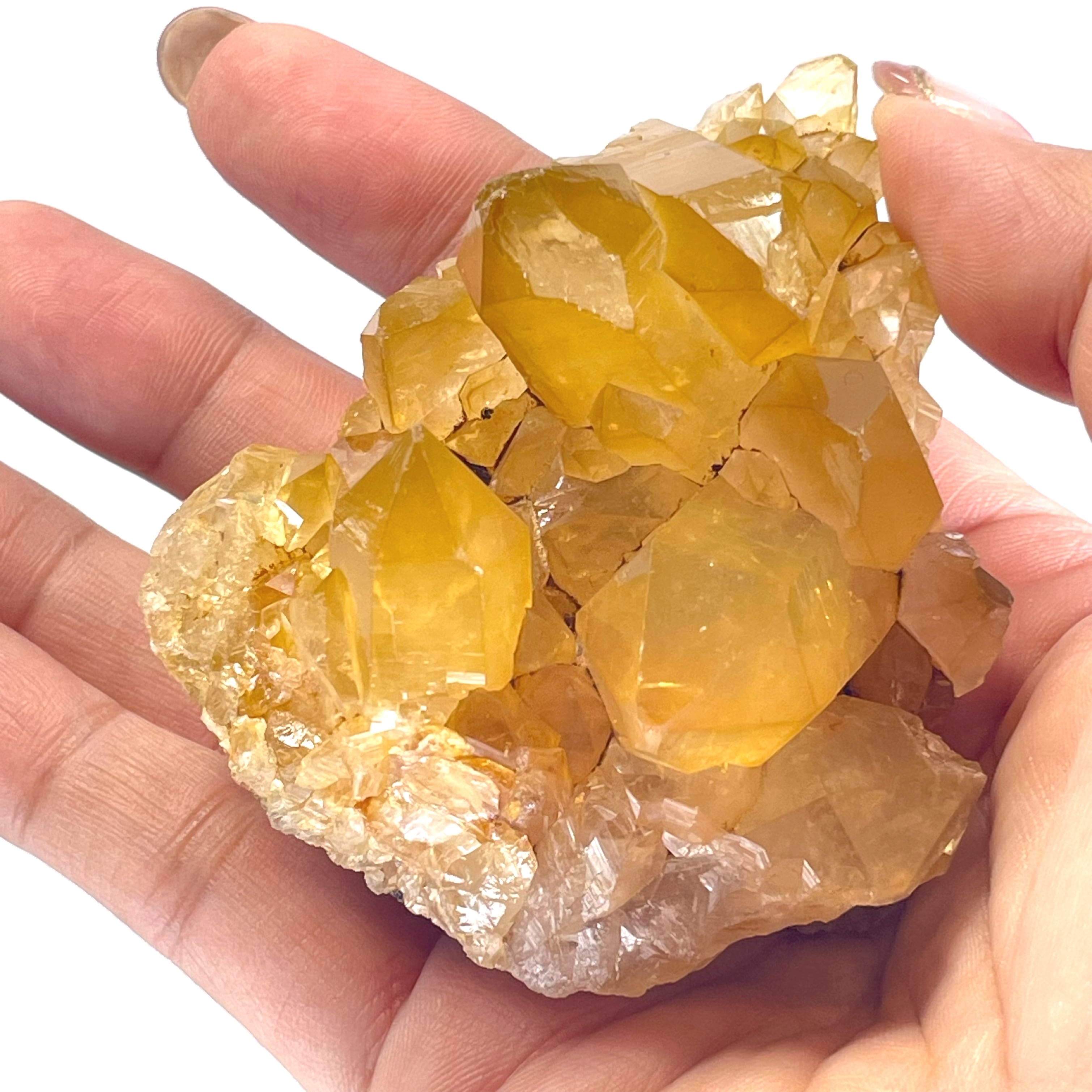 シトリンは、水晶の一種で石英に含まれる鉄分から色がつき、淡い黄色から明るい琥珀色まで様々な色があります。こちらのシトリンクラスターは濃厚なイエローが美しく、覗き込むと虹も見えます☆テリつやも美しいクラスターです。